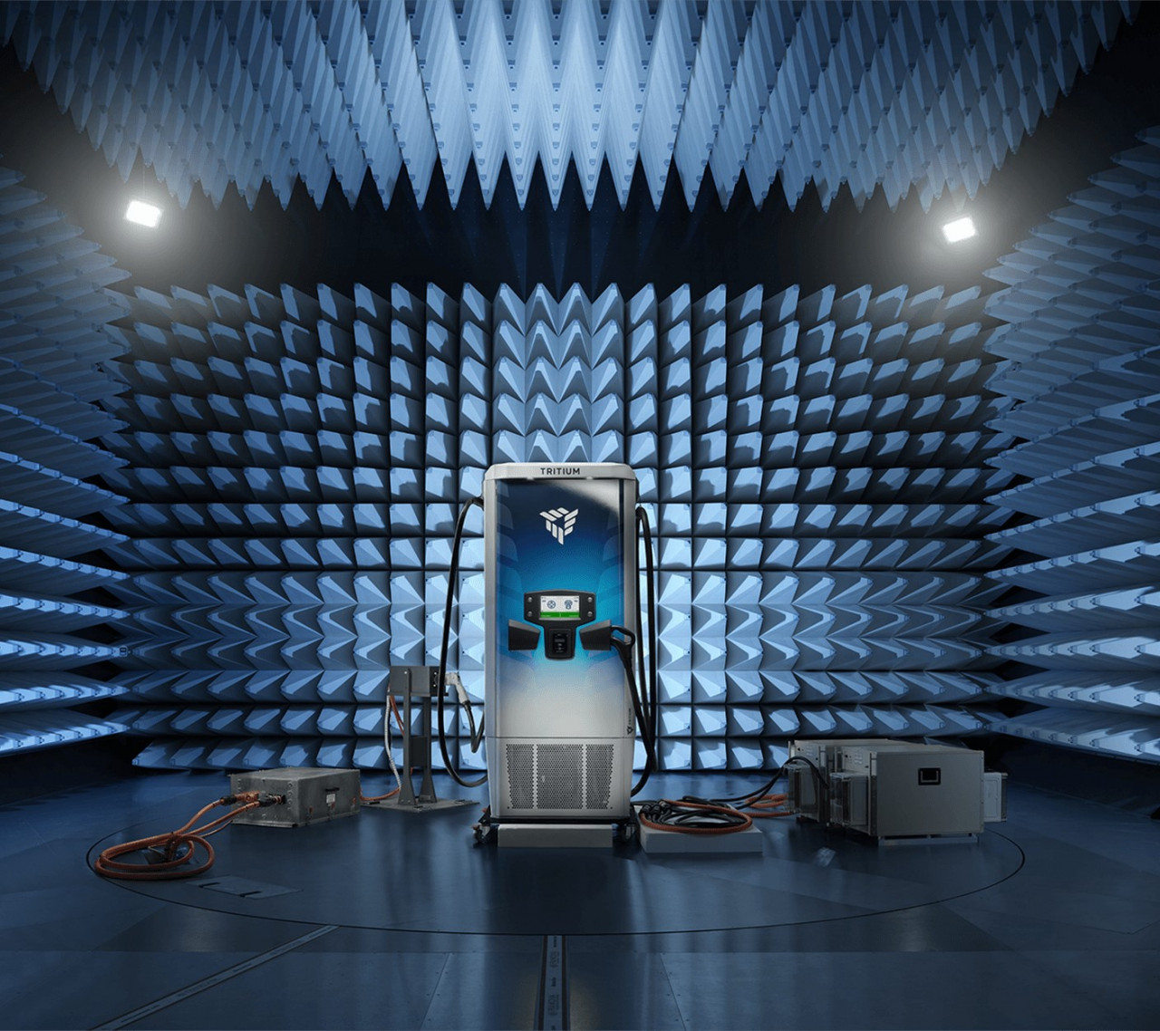 The facility features one of the highest power commercially accessible EMC testing chambers in the world. The facility is designed to deliver up to 720kW of regenerative power from its integrated system with fully integrated AC and DC power feeds, ensuring Tritium can test devices that demand very high power levels to Federal Communications Commission (FCC) and International Electrotechnical Commission (IEC) certification requirements. The custom-designed chamber features a five-metre turntable with high-power connections, providing Tritium with the ability to test a full high-powered charging system, consisting of the charger itself and an accompanying power cabinet.